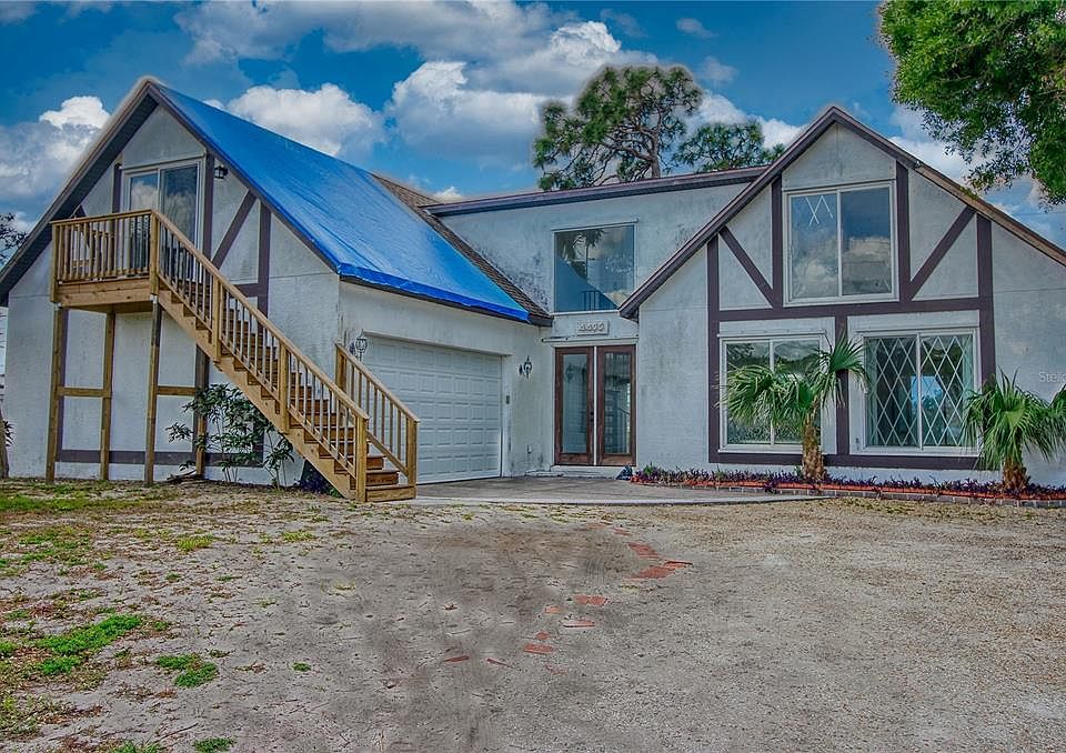 Welcome to your new home! This 2 story lakefront Tudor pool home was custom-built for its original and only owner and is now available for you to make into your custom dream home! This extraordinary home has been built with metal to withstand weather and time. Upon entry into this unique home, you will find a grand great room with a custom-built spiral staircase and breathtaking floor-to-ceiling glass windows for incredible daytime water views and absolutely gorgeous western sunsets. The open-floor kitchen concept is great for entertaining and all-day water views and colorful sunsets every evening. This home has been built with permits and to code with original floor plans available to the new owner. The caged-in pool overlooks the lake and is like a full-time nature show with birds and ducks and always so much life to enjoy. This home has so many options for its new owner. The upstairs is a full flat with a full bathroom, kitchen, hidden rooms, storage, and its own balcony. This flat was rented for $1,200 annually per month and has its own private entry staircase for outside entry. Or, this spacious upstairs living space is perfect for a traditional mother-in-law suite or perhaps office space or living quarters for a college student. This location is so fabulous as it is in close proximity to dining, and shopping, minutes from Gulf beaches and historic downtown Venice. Come see this amazing artistic dream home and make an offer today…dreams do come true! (Home exterior needs to be painted, the Home interior needs to be painted, the Home needs flooring replaced throughout, and the roof needs a few shingles replaced that were broken/removed. This home also needs TLC throughout). (tarp is on the roof as a precaution/protection). 2 A/C Systems and one is new.