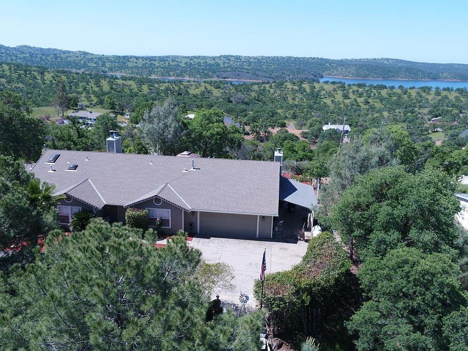 Serene Lake Don Pedro views from this custom built home on top of the hill, hidden from street view on 2.1 acres. This location is perfect for a work from home activities. Enjoy the unexpected visits of dear, quails, wild turkeys and the beautiful sunsets while relaxing on the back patio looking at the lake. This 2442 SF home with 3-4 bedrooms, and a huge living/family room with an open floor plan offers 3 wood burning fireplaces, 2 jaccuzzi tubs and 3 glass sliding doors facing the lake view to the back of the house. Its kitchen offers lots of cabinets and counter top space. There is a 2 car attached garage and a detached barn/garage.