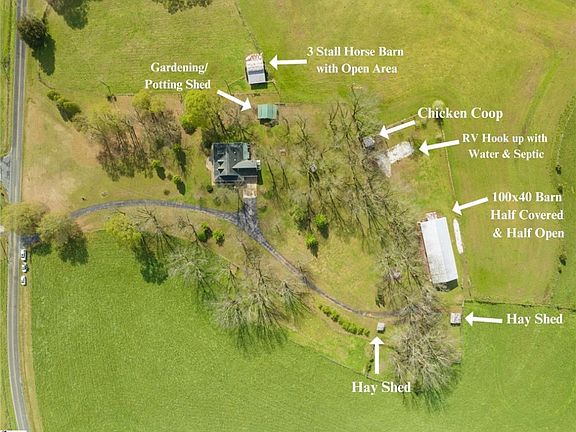 39.8 UNRESTRICTED flat, fenced pasture land that is bordered by a stream on 3 sides, Cape Cod style home (2983 sq ft), 100X40 Barn, 3-stall horse shed (could accommodate 6 stalls), Gardening/Potting or She Shed with water access, chicken coop with water access, multiple hay sheds, RV hook up (50 and 30 AMP) with water and septic with over ten water hook ups around the property!!! Enjoy the fruits of someone else’s laboring literally, there are producing pecan, peach, plum, pear or apples trees and blueberry bushes and weeping willow. The scenic oasis not only offers an immediate opportunity to move-in and enjoy farm life with cattle, horses, and farm animals, it also offers two types of grass for harvesting (Costal and fescue). This acreage is in two parcels. The 5.07-acre track has a 3 bedrooms, 2.5 bath w/ bonus home, RV