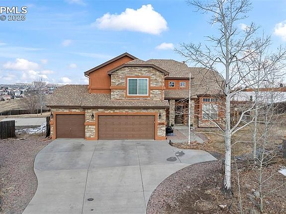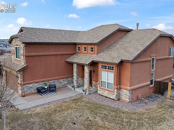 Welcome to your dream home, a stunning 4,655 sq ft masterpiece featuring 6 spacious bedrooms and 4 bathrooms, nestled on a sprawling 3/4 acre lot in the highly sought-after Canyon View community with NO HOA! This exceptional property features one of the largest lots in the area, offering unparalleled space and privacy. Step inside to discover four generously sized bedrooms on the upper level, including a magnificent primary suite complete with a lavish 5-piece en-suite bathroom and expansive walk-in closet. Every bedroom features new paint, modern blinds, and new carpeting, ensuring a fresh and inviting atmosphere. The main level is designed for both comfort and elegance, showcasing a grand foyer, a cozy living room, a formal dining area, and a family room perfect for relaxation. A designated office provides a quiet workspace, while the well-appointed laundry room and an eat-in kitchen offer both style and functionality. Enjoy seamless indoor-outdoor living with a walk-out to your beautifully landscaped and fully fenced backyard, complete with a basketball court or RV parking pad. Venture down to the finished basement, where you'll find two additional large bedrooms with walk-in closets, a state-of-the-art theater room equipped with a projector, screen, and 13 recliner chairs, a full hall bath, and a versatile rec room featuring a wet bar. This home is an entertainer's paradise, perfect for hosting family gatherings and events both indoors and out! Situated on a quiet cul-de-sac backing to open space, this home boasts breathtaking views of Pikes Peak and the surrounding mountains, allowing you to relish in the beauty of Colorado sunrises and sunsets every day. Ideally located near schools, a hospital, shopping, dining, and parks, this property combines luxury with convenience. Don't miss out on this extraordinary opportunity—welcome home! Explore the 3D tour and aerial video to fully appreciate the beauty and space this remarkable residence has to offer!