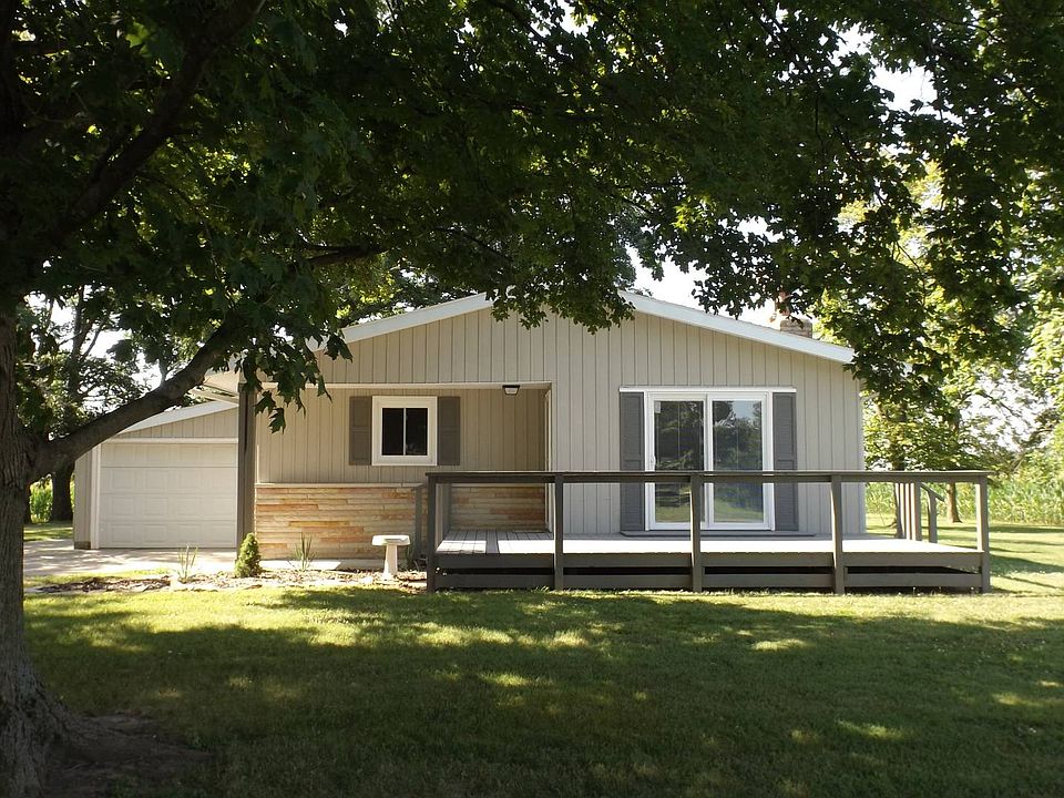 New Listing: This beautiful newly updated mid century modern home sits on one acre of ground on the edge of town with mature trees . Outside updates include new roof 2018, siding painted 2019 and new replacement windows, and trex deck. Inside this home has an open conept living/kitchen area with new appliances including stainless refrigerator, stove and dishwasher, all new kitchen cabinets and island. The large living room has a lovely fireplace for those cold winter evenings. New Pergo flooring throught the living area with new carpet in the bedrooms and new interior doors. Brand new completely updated bathroom with double sinks and shower/tub combo. This home also includes a partially finished basement with large family room, and laundry area. 2010 square feet of living area including basement. set up an appointment today!!