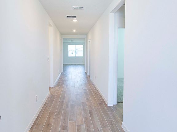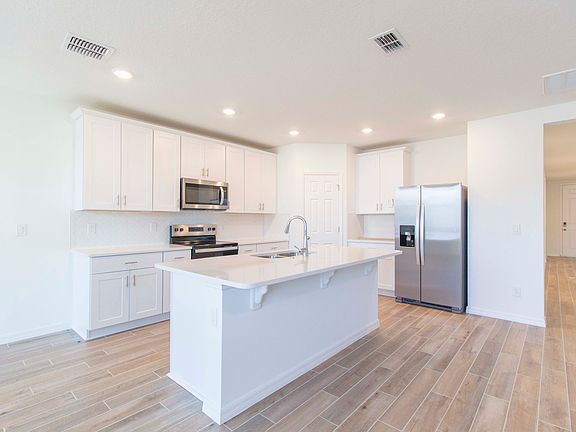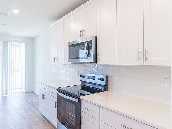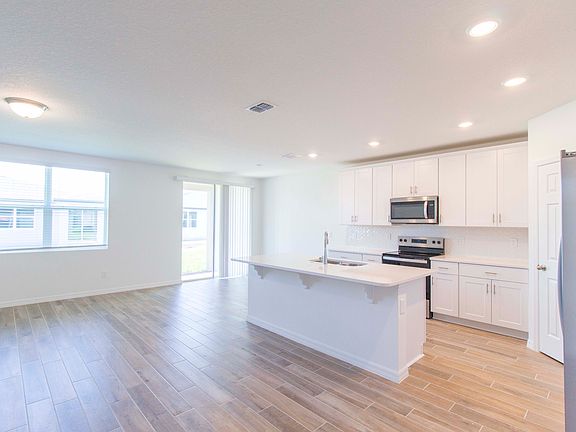 Ready now! Brand new Energy Efficient 4 bedroom 3 full bath (Three full bathrooms) single family home in The Meadow at Crossprairie community in St Cloud FL. This single story home newly built by Meritage Homes features wood look porcelain tile plank flooring in all the common & wet areas, and carpets in the bedrooms. Kitchen features 42 inch cabinets, herringbone pattern style tile backsplash, quartz countertops with a kitchen island, all stainless steel whirlpool appliances, and a large pantry. This open concept layout creates a unified living space with a large great room that overlooks the kitchen and dining area. The primary bedroom features an ensuite bathroom with a spacious walk-in closet, walk-in shower, dual sink vanity, and a private water closet. The home also includes a smart system, laundry room with whirlpool washer & dryer, a covered and covered back patio, 2 car garage, pavered driveway, a covered front entry way, and a natural stone facade. Home has a direct waterview from the front of the house with no front neighbors. Small pets may be considered.