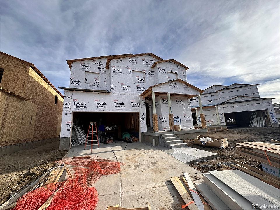 **BRAND NEW HOME** Ask about up to $20K in builder incentives with preferred lender. The Pikes Peak plan features an exclusive three-car tandem garage. Entering the home, you pass through a large mud room accompanied with a bonus indoor "sports" storage room. An elegant kitchen, spacious dining area, and den office space complete the main floor. The first floor also boasts a completed front porch and covered area patio, a must-have for entertaining in the beautiful Colorado weather. Head upstairs and you will find your ultimate retreat in your spacious primary suite. you will also find a welcoming loft and oversized laundry in this home of your dreams. The house is loaded with premium options and finishes throughout and includes front and back landscaping with full fencing. This lot backs to open space and will have some great views! Photo is representative.