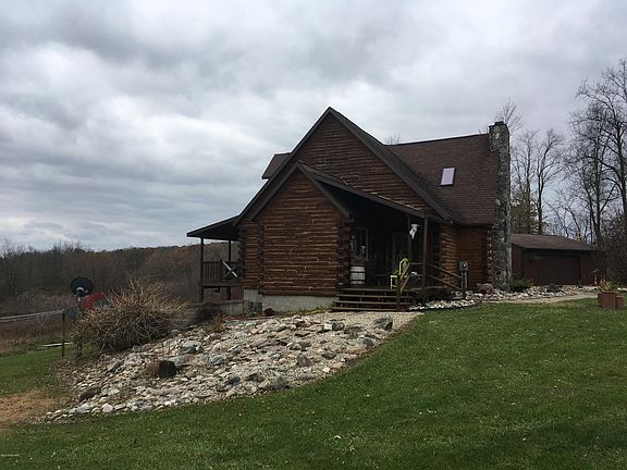 Wow! Stunning 3+ bedroom log sided home on 4 acres with pond frontage. If you're looking for peace and quiet, this is the home for you. Set almost a 1/4 mile off the road, this amazing home offers a big field stone fireplace, vaulted ceilings, full walk out basement and a covered back porch with a tremendous view of wildlife. Main floor features kitchen and dining, large living room, den/office and master suite. Two bedrooms a full bath and large landing area upstairs with a great view! Full walkout basement is ready for your family room. Brand new furnace and windows. This property offers the kind of peace and quiet you dream of and just 3.5 miles from town. 26x32 garage plus nice storage shed for lawn equipment.