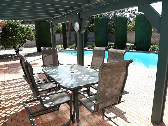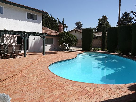Beautiful Foxenwood F3 Spanish style plan with tile roof, home sits on a cul-de-sac. Great curb appeal, elegant front door graces this home, tile entrance with cathedral ceiling leading up to the 2nd floor. Tile entry, with mirror decor under the staircase. Formal living and dining rooms with newer carpet. Kitchen appliance have been updated from the original, and counter tops, breakfast bar plus nook. Tile flooring in the kitchen and baths came from Japan. Large family room with rock fireplace and wet bar, storage room, inside laundry and 1 bedroom and bath downstairs. Upstairs with 3 bedrooms and 2 baths, master has double sinks. Newer dual pane windows throughout. Nicely landscape, block wall surrounds home with fruit trees. This home has a beautiful pool for the hot summers with brick patio that surround the pool and walkway, plus RV parking, storage shed on the side of the home. A must see..Seller will entertain back up offers