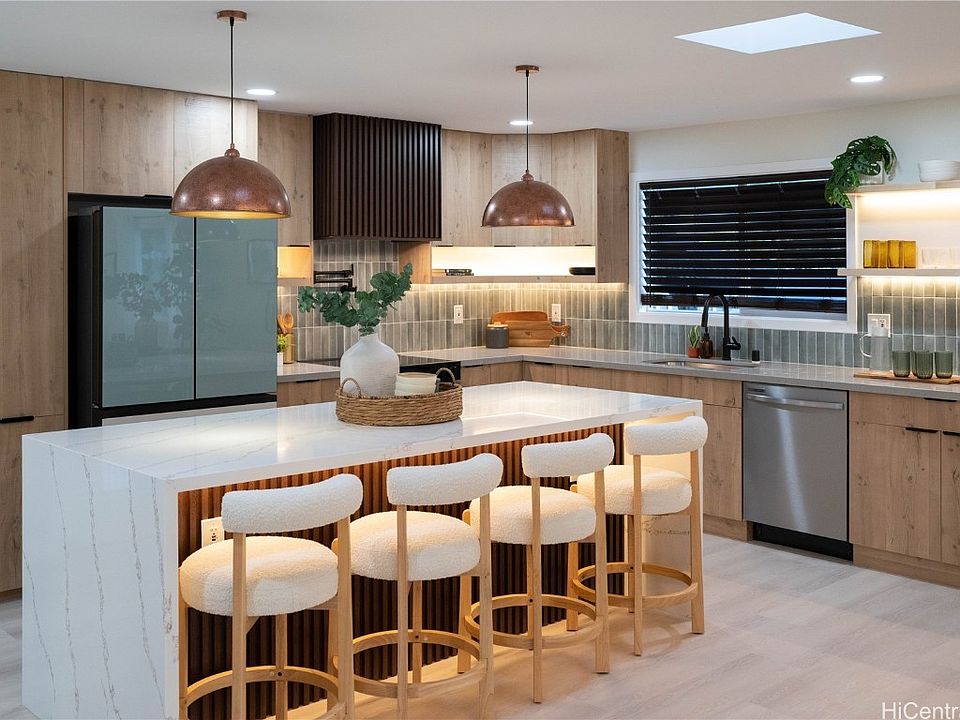 Welcome Home to this stunningly remodeled 4-bedroom, 3-bathroom Kaneohe home complete with an additional studio featuring a separate entrance, en suite bathroom, wet-bar and a private fenced-in yard. This exceptional property offers an unparalleled blend of luxury and versatility, making it ideal for multi-generational living or rental potential.?Modern + thoughtful design, with stand-out features such as high-end finishes and accent lighting throughout. The home boasts two primary bedrooms, spacious open floor plan with fireplace, an outdoor deck equipped with a built-in BBQ area perfect for entertaining, and much more. The level of design and attention to detail is unmatched, and a rare opportunity to own this custom home. Covered parking in the driveway plus additional parking for the studio provides added convenience for guests, gathering + more. Just minutes from Kaneohe Bay, a short drive to the beautiful beaches of Kailua, and a quick trip over the Koolau mountains to all the amenities + attractions that Honolulu has to offer.