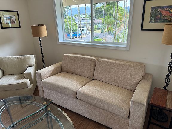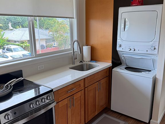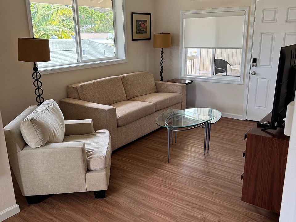 Totally remodeled and FULLY FURNISHED one bedroom, upstairs unit in Kaneohe for rent. Everything is new including the paint, floors, insulation, bathroom, plumbing, kitchen, washer/dryer and mini-split AC. There is an outdoor space to enjoy the breeze and the awesome view of the Ko'olau mountains. The home is on quiet street and the neighborhood is great. We are near Windward Mall and short drive to all the restaurants and shops in Kaneohe. One parking space is provided. There is Kaneohe Bay access within walking distance and a small sand beach area as well. The lease term is flexible. All utilities included. Available to move in now!. I'm sorry, no pets allowed. Again, the home is fully furnished. 30 day minimum stay required. Owner pays for electricity, water and wifi.