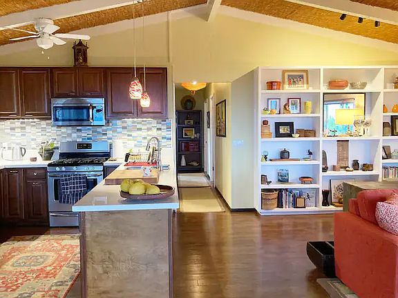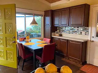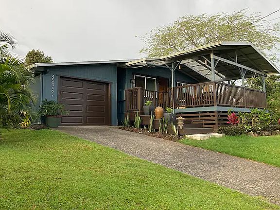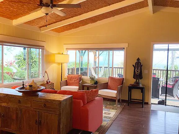 From the moment you arrive at this oasis of a house at the end of a quiet cul de sac, it's immediately clear that this is a much-loved, exquisitely tended home. Its richly painted colors and generous lanai facing the sea are just the start of the journey into this immaculate 3 bedroom/2 bathroom classic Hamakua home. Through the front door, find a large, high-ceilinged and open plan space with living room, dining nook and sparkling clean kitchen. A side door off the kitchen leads to a fully enclosed garage with laundry and generous storage. The private living areas and bathrooms are off the living room main corridor, where the door slides open on the back bedroom to reveal a second covered lanai. Prepare to lose your breath as you step into an extraordinary, fully-fenced garden with a waterfall pond, sheltering trees and multi-textured fronds and foliage in an outdoor private playground rich with colorful dreamy plants. All this within a minute's walking distance of historic Honoka'a Town, a gem of Hawaiian authenticity with unspoiled architecture, a world-class coffee roaster and one of the best chocolate makers on the island.