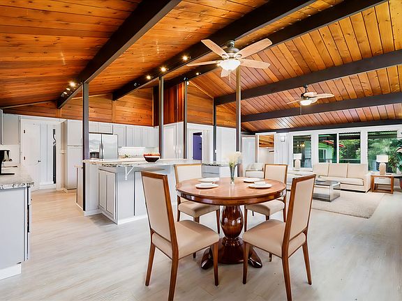Step inside and discover the heart of the home - an updated kitchen boasting ample storage, elegant granite countertops, and a spacious island, perfect for meal prep and casual dining. The open concept living and kitchen area is accentuated by vaulted/open beam ceilings and an abundance of windows that flood the space with natural light, creating a warm and welcoming atmosphere. The flooring throughout the main living area and all four bedrooms is a wood laminate for style and easy maintenance.