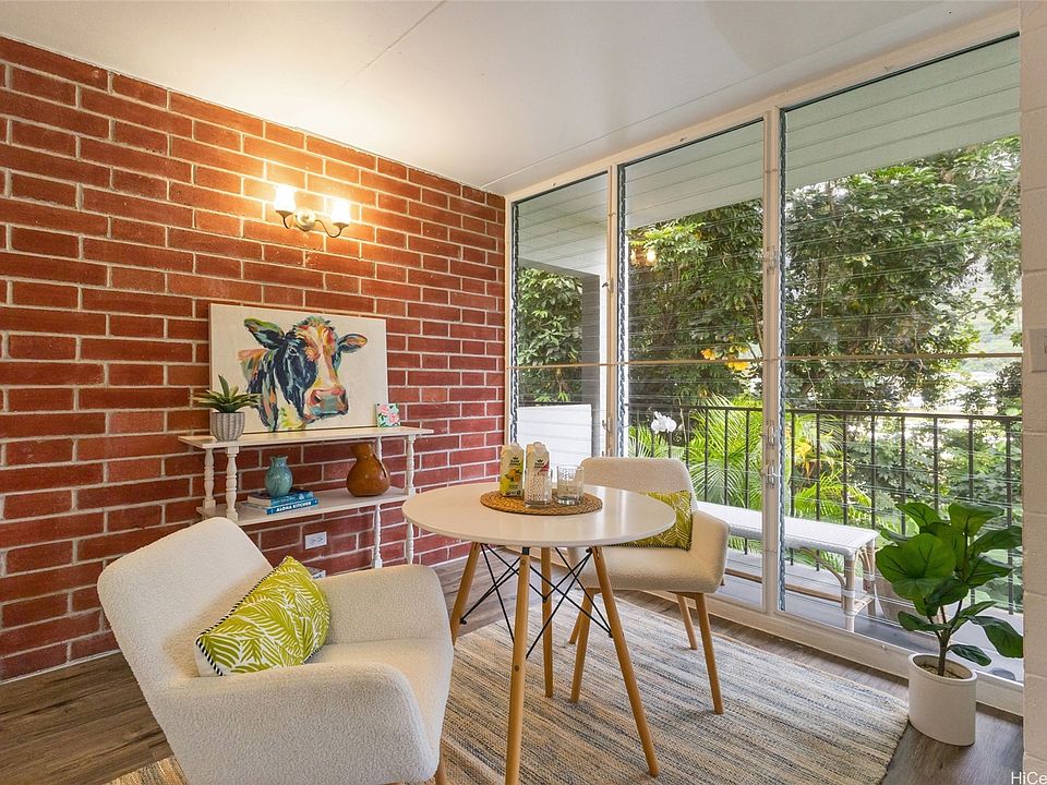 Welcome to your charming home nestled in a "treehouse" setting w/ an abundance of natural light streaming in throughout the day. Enjoy serene views of greenery from the dining area, living room and kitchen as you prepare or enjoy your meals. This move-in ready home boasts vinyl plank flooring (installed in 2020), a washer/dryer combo (added in 2022), & recently upgraded appliances, including a refrigerator & toilet (2024). Practical hallway storage offers convenient space for bulk purchases, seasonal decorations or winter clothing. Tucked away from the parking lot and road, the home provides a peaceful retreat where you can also keep an eye on loved ones enjoying the nearby basketball court. Guests will appreciate the close proximity from guest parking to your front door. Located minutes from Likelike Hwy, H-3, Windward City Shopping Center, & more this property is a true gem. Fish in aquariums & caged birds are welcome (please note: cages are not allowed on the lanai). RE: emotional support animals, refer to pet policy for verification.