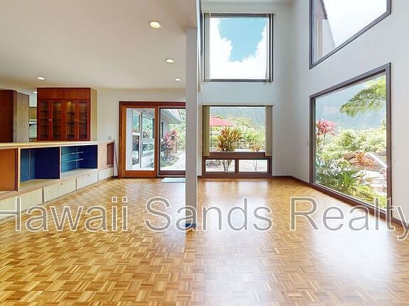 A Rare Gem with Stunning Ko'olau Mountain Views! Embrace the beauty of island living in this remarkable 6-bedroom, 3.5-bathroom residence, boasting approx. 3,912 sq. ft. of thoughtfully designed space - perfect for family gatherings, entertaining, or simply relaxing. Upon entering, you're welcomed by a sunken living room with soaring ceilings, a charming wood-burning fireplace, and sliders that open to the lanai and swimming pool. Adjacent to the living room is a formal dining area, distinct from the casual eat-in kitchen. Nearby is the half bath, a spacious storage room, and a dedicated laundry area. The main level also features a primary suite with a cozy sitting area, split AC, and en-suite bathroom with dual showers, a spacious dressing area, and two closets. Upstairs, five additional bedrooms and two full baths provide ample flexibility, all complemented by breathtaking vistas. The two-car carport and an extended side driveway ensure ample parking space, while the home's solar panels reduce utility costs. Easy access to H-3 streamlines commutes to Pearl Harbor, Hickam, and the airport. Kailua Beach, Kaneohe Marine Corps Base, shopping & restaurants are just minutes away. No Pets. No Smoking. All occupants must qualify on their own as co-signers are not allowed. $30.00 application fee per adult. Amenities: Lanai, Swimming Pool, Photovoltaic Panels, Breathtaking Ko'olau Mountain Views, Additional Driveway/Parking