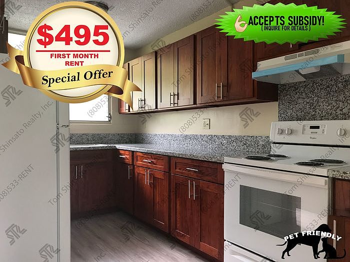 FEATURES Bedrooms: 2 Bathrooms: 1 Parking: 1 (available for $100 per./mo.) Property Type: Apartment Floor : Ground Includes: Range / Oven Refrigerator Garbage Disposal Coin-Operated Laundry Utilities Included: Water DESCRIPTION 2 BD/1 BTH/1 PRK apt in Kaneohe! Available convenient walk up apartment in the center of the windward side right off Likelike Highway! Close to shopping malls including Windward Mall, restaurants, gas stations and much more Kaneohe has to offer! Laundry on site! Spacious lanai to enjoy the views of the Koolau mountains! Short distance to Kaneohe Marine Core Base/H-3/Freeway access! LEASE TERMS First Month: $495 Monthly Rent: $ 1545 (after first mo. see details below) Monthly Parking Rent: $100 Security Deposit: $1645 Lease: 1 Year Pets: Allowed (restrictions apply) Smoking: No Application Fee: $25 per adult PET POLICY Rent/Pet Fee: $50/mo. Pet Security Deposit: None Weight: 20 lbs max Breed: Restriction Apply Renter's Insurance: Required CONTACT INFO Tom Shinsato Realty, Inc.com Follow us on Instagram & Facebook @TSRHAWAII For more units available or to apply online! Phone: 808-533-RENT DISCLAIMER Rental prices, discounts, availability & lease terms are subject to change without notice. Any discounts offered for this unit are subject to qualifications. Pictures displayed may differ from actual unit. Square footage of unit are approximations. All information deemed reliable but not guaranteed. do NOT contact me with unsolicited services or offers Rental Terms: Rent: $1,545, Application Fee: $25, Security Deposit: $1,645, Available Now This property allows self guided viewing without an appointment. Contact for details.