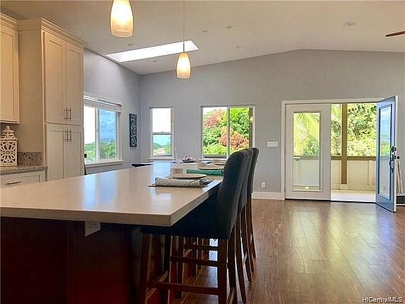 Numbers! Perched atop Halekauwila, Kaneohe, in a small development w/ treetop and sunset views, built 2016, this home has everything you need! Upstairs boasts open floor plan with high ceilings, skylights, island bar, dining area, split AC, ceiling fans, modern tiled bathrooms, quality wood look laminate throughout. 3 upstairs bedrooms include spacious master w/ walk-in closet and en-suite bath/walk-in shower. Downstairs, permitted rec area, holds 912sf of living space w/ AC, separate entry, wet bar and full bath/shower! Huge garage 576sf lends space for 2+ cars, storage, beach toys! More parking outside too! Conveniently located to shop, dine, coffee and easy highway access to town, JBPHH, MCBH. With today's rates, this is a special owner occupant OR investment cashflow opportunity!