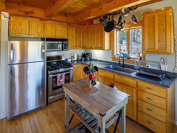 Big mountain views from this house! Large bright windows, hardwood floors, woodstove heat, cathedral ceilings, exposed beams. This home is such a perfect ski get away. The deck facing Bigelow Mountain range, is right off the kitchen and can be enjoyed year round. Bonus 1 bedroom, 1 bath apt for rental income.