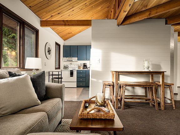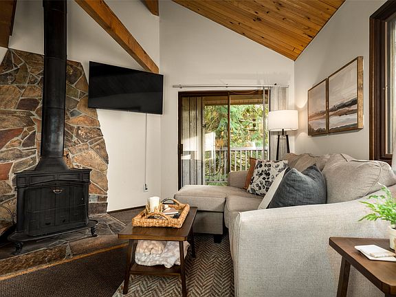 Experience the comfort of this Ptarmigan Village condominium on the road to Whitefish Mountain Resort. This furnished 2-bedroom plus loft, 2-bath condo sleeps 8 and offers access to indoor and outdoor pools, a hot tub, sauna, and lake access. Enjoy a cozy mountain feel with wood-planked ceilings, a stone fireplace, and a wood-burning stove. The main floor features a modern kitchen, dining for four, and a covered balcony. The lower level includes a queen primary bedroom and a bunk room with a twin-over-full and trundle. A loft with two twin beds adds extra sleeping space. With peaceful forest surroundings and convenient on-site parking, this welcoming three-level condo is an ideal Whitefish retreat. Ptarmigan Amenities: On-site amenities include walking trails, indoor pool with outdoor hot tub and sauna, outdoor pool, tennis, pickleball courts, fishing pond, playground and a nearby private Whitefish Lake beach area.