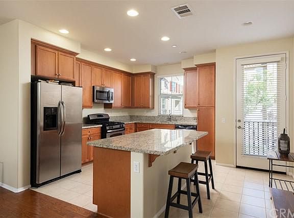 This 2011 built tri-level townhouse comes with an incredible open and well designed layout. The newly painted interior walls brought out the brightness and coziness of the home. It has a full suite conveniently located on the first floor. The stairs will take you to the second level with an amazing open living area where you can entertain your guests serving dinner and wine on the gorgeous kitchen island. This home boasts beautiful wood floors and classy granite counters along with stainless steel appliances. When you open the door next to the kitchen you'll find an outside patio perfect for morning tea and coffee. The laundry room is located by the second floor powder room. The spacious master bedroom comes with bathtub, stand-in shower and walk-in closet. The community has recently been painted and the amenities include a BBQ area, kid's play area, outdoor fireplaces, and a sparkling pool & spa. This home is located near restaurants, shopping (walking distance), parks, hiking trails , schools, toll roads & freeways. Must hurry as this gem will not last in the market!