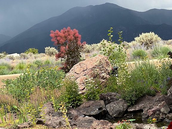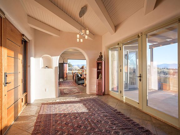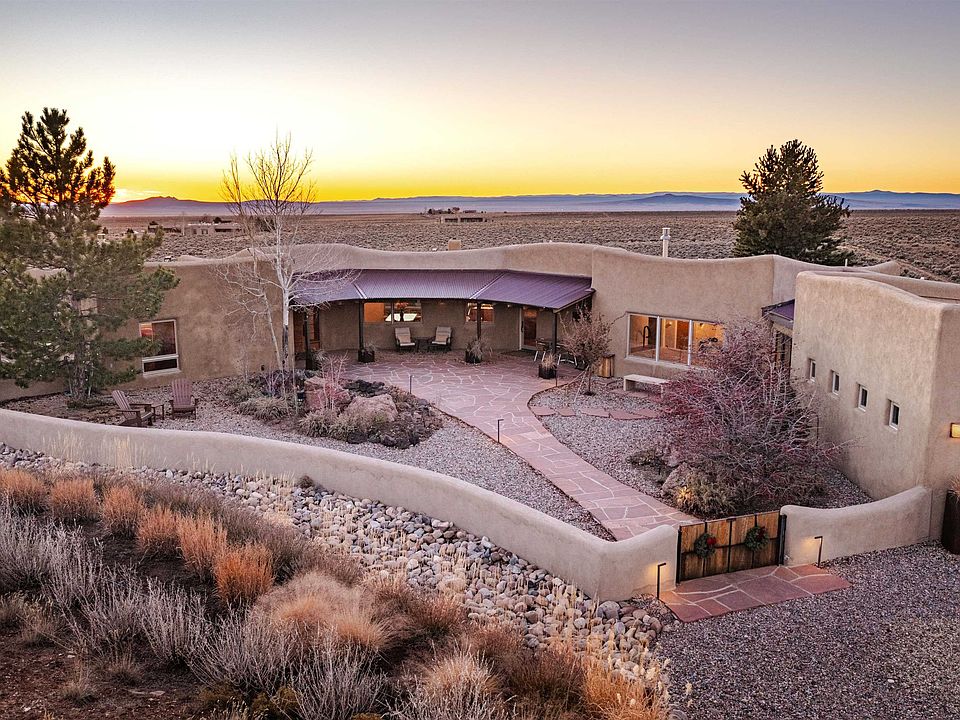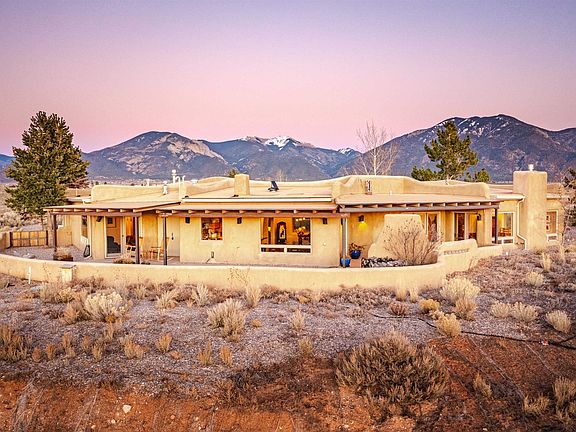 EXPECT THE EXCEPTIONAL. Nothing was spared in design and detail to create one of the most beautiful homes you ll see. Endless views in all directions provide the wow effect from the moment you enter the glassed foyer of this unique 3, 300 sq. ft. 2/3 bedroom home, with office, an endless pool, sauna, and a 4car heated garage on 4.17 ac in a desirable Northside location.( all on one level with no interior steps. Handicap friendly) Current owners have done extensive remodeling/renovation and have lovingly maintained the property. Tucked back from the road, a winding drive takes you to the striking walled entrance which boasts admirable native landscaping plus a small pond and fountain. Entering, the home is awash in natural light and will brighten even the darkest moods. The living room has mountain and mesa views and a fireplace to add ambience when night falls. The cozy TV/library room adjoins and seconds as a 3rd br. for guests. You ll appreciate the sensual lines running through as you move from room to room. Even a non-cook will appreciate the well equipped kitchen with stainless, granite and more views. The dining room, complete with corner fireplace, is designed to enjoy sunset vistas to the west while catching the moon peak up from Taos Mountain on the east. Stunning. The primary bedroom has big views, walk-in closet , bath with bidet and oversized walk-in, roll in, shower. Another bedroom also features a walk-in closet and en suite bath. If you wake up with the birds, have an envigorating, healthful swim in the endless pool and follow up with a sauna to start the day off right. Once again, the views will amaze. Love the privacy and quiet but need to stay connected? Connect in the office. Fiber optics will get you there so you can stay here. Relax on the front portal and enjoy dead on views of Taos Mtn. or entertain a couple or a crowd on the back patio which provides front row seats for candy colored sunsets and a kiva fireplace to take off the evening chill. Extensive xeriscape landscaping includes a river of rocks for drainage and a 5,000 gal cistern to catch water plus a gray water system for irrigation. People and eco-friendly pumice construction adds to the appeal. You ll love the location just 15 min. to town and 20-25min. to Taos Ski Valley and USF. Golfing, fishing, rafting, kayaking are also nearby or just walk out the door and find miles of roads to get in those steps. Want an easy move? Property can be sold turn-key. Very private and the quiet is palpable- an oasis of serenity, if you will. Magical.