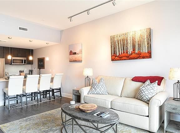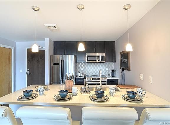 Income Producing - Furnished - Permitted Short Term Rental - 1-Bedroom Condo - Located in the heart of downtown Asheville, this immaculate 777sf unit built in 2018 offers beautiful sunsets from the West facing balcony, open floorplan/layout, wide-plank wood floors, breakfast bar, modern kitchen, quartz counters, stainless steel Bosch appliances, tiled shower, tile floors, closet space, additional storage room, 1 deeded parking space in the secured parking garage, low utility costs, and low HOA dues. Purchase the unit furnished and continue to rent it out short term with on-site rental mgmt. 45 Asheland is a 7 story, 39 unit condo building located steps from world-class dining, shopping, craft breweries, live theater, music venues, and art galleries.