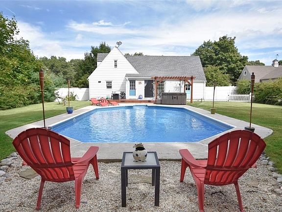 Stunning cape set on a cul-de-sac with a backyard pool oasis with artistic details everywhere you turn! Step into the foyer and enter the spacious living room with hardwood floors graced by a fireplace with shiplap details and a pellet stove insert. The dining room with charming vintage built-in hutch leads to the remodeled kitchen with breakfast bar, quartz counters, and stainless steel appliances. A sliding barn door opens to the first floor master bedroom with vaulted ceiling that looks out upon the a gorgeous outdoor oasis with new deck, inground pool with new liner and mechanicals, 2 year old spa tub, and shed. Also on the first floor is a remodeled full bath with walk-in shower. Upstairs are two more spacious bedrooms and another beautifully remodeled full bath with vanity area and barn wood wall. Other features include a 3 year old roof, two car garage, attic fan, and nice level yard. Welcome Home!