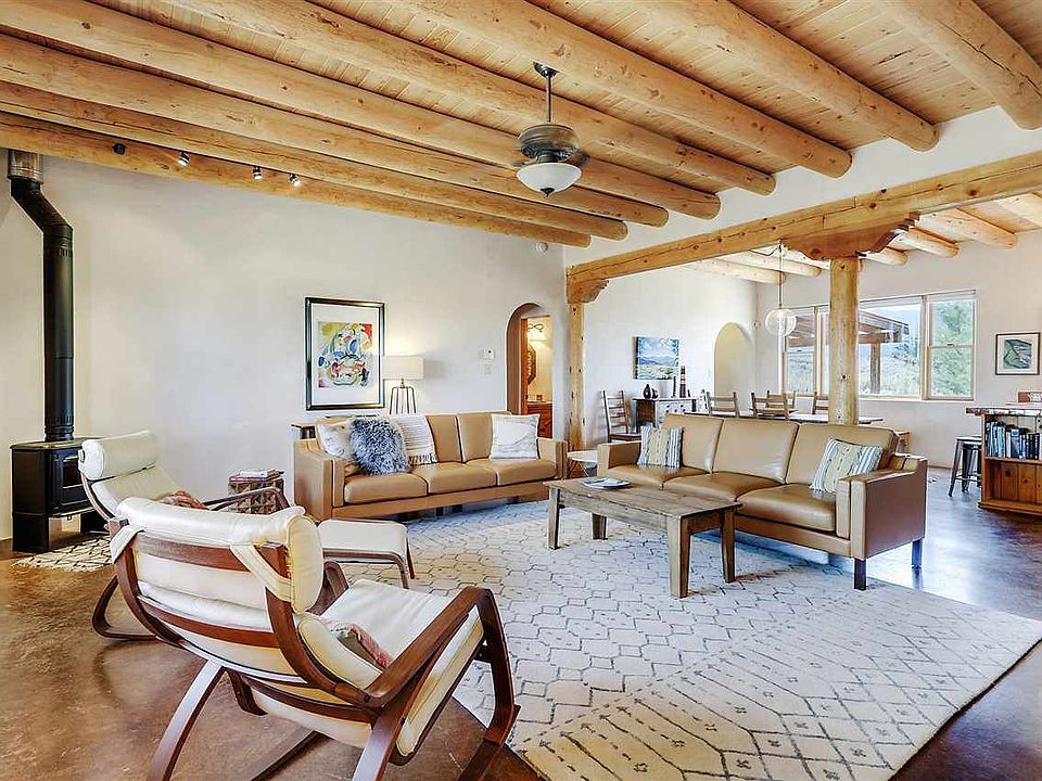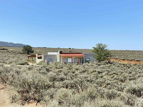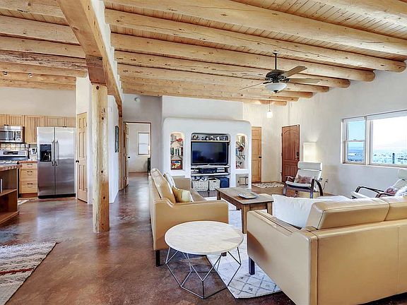 Sweet and simple, isn't that the spice of life? This 1567 sq ft, pueblo-style home is surrounded by open space and big skies! Easy-flow, split floor plan with a large great room that includes an efficient, open kitchen with dining counter, pantry and newer appliances, a dining area and large living room that takes advantage of the views and features high ceilings with vigas, built in display shelving, and a modern wood stove. 2 spacious bedrooms and baths. Modern light fixtures add a spirit of style. Catch the sun dancing over the mountains from the North facing portal. Additional features include: Easy care concrete floors, attached carport, spacious laundry room, ceiling fans, radiant floor heat, and a Bocce Ball court! Check out the 3D tour!