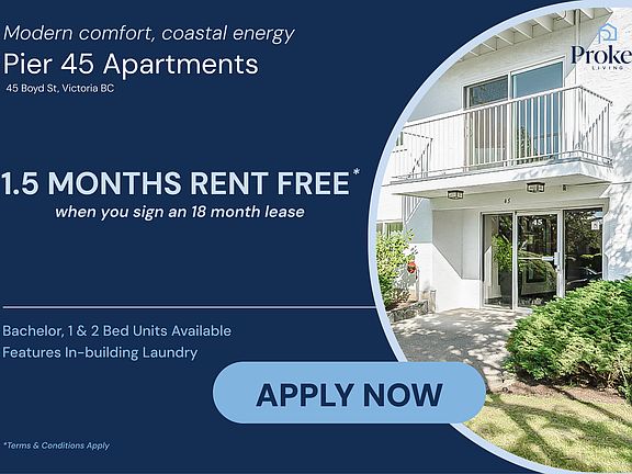Welcome to Pier 45, where modern living meets the charm of Victoria's iconic waterfront. Nestled in the heart of James Bay, this reimagined four-storey rental community offers 71 stylishly renovated suites with bachelor, one-, and two-bedroom layouts. Each suite features sleek cabinetry, premium appliances, and stunning bathrooms designed for comfort and contemporary living. Select homes also include in-suite washer and dryer units for added convenience.