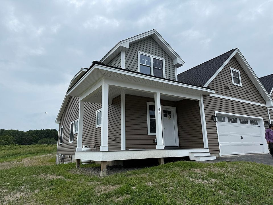 Last 3 Bedroom available until Phase 4. The Pride design is a spacious two-story cottage home that greets you with a large covered front porch, leading into a tiled mudroom with access to the two car garage. The kitchen, dining area, and living room all share the same inclusive floor plan that opens to a large deck at the rear; enjoying views of the rolling landscape Brooks Edge Farm offers. A balcony staircase brings you from the first floor living space up to a common hallway and den. The additional full bathroom, a laundry room, linen closet, as well as two roomy bedrooms are all located on the second floor. The primary suite is located on the first floor and comes standard with a walk-in closet, granite countertop vanity, and large shower. Customize this floor plan to your own needs with optional additions such as a first floor washer/dryer hookup, a second floor enclosed office, or seasonal bonus room off the living space, plus more! This unit has a walk-out basement standard with a full sized unfinished basement for storage/utilities and some daylight units will have expansion potential for additional bedroom needs.