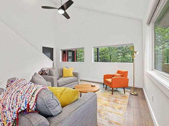 The kitchen is fully stocked with all the supplies needed to make a home-cooked meal, baked goods, or to cook out on the grill. With new appliances, a coffee maker, and seating for 7 people, this space will make you feel right at home. There is also a relaxing corner with two loveseats and a chair, the perfect place to curl up with a book. The main living space includes more lounge seating, a 65-inch Smart TV to stream your favorite shows, and access to the upper patio space. There is even a Peloton bike to log in to and keep up with your routine. The outdoor area is surrounded by woods and features four outdoor patio spaces with woodland views and a gas grill. A washer and dryer are available for guest use.