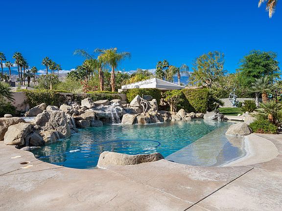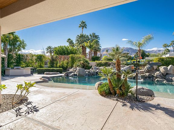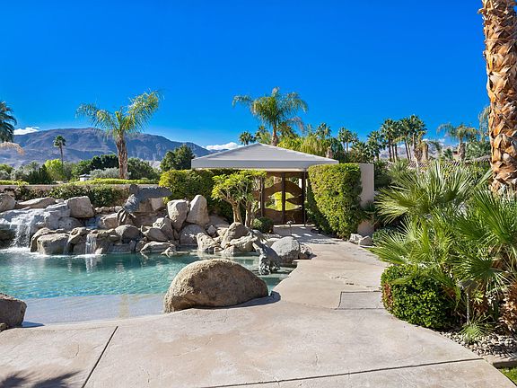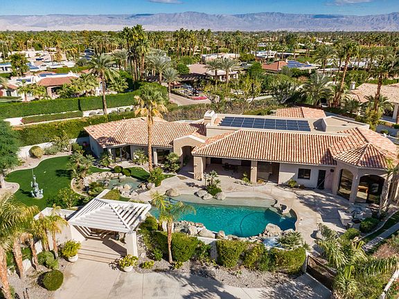 Welcome to Clancy Lane South, a private, gated community of 32 custom homes off most prestigious Clancy Lane, in the heart of Rancho Mirage. Located at the end of a quiet cul-de-sac, this unique property enjoys West facing, North facing and East facing yards, In the West you have beautiful mountain views, from the enormous resort- style pebble tech beach entry pool with spa, waterfalls, fountain, pond, BBQ and loads of entertaining space when you want to enjoy the sun. On the North and East sides, you have expansive lawns and private areas to enjoy the afternoon shade and morning sun. This home is IDEAL for those who love to entertain both indoors and outdoors!! Home features include 4 bedrooms, (1 currently used as office) plus another office/hobby room, 5 bathrooms, huge living/great room, open kitchen, a wonderful family room with kids loft and wet bar, enormous laundry room, and a hidden oversized 3 car garage with long private driveway. Other features include OWNED solar by Renova, walls of glass on all sides, with tons of sunlight, beautiful wood inlaid ceilings, Vantage lighting system, large walk in pantry and so much more!!! As incredible as it already is, make this home your own with a few minor adjustments and updates, the potential is endless!! All this on a flat nearly 33,000 sq ft lot. Enormous potential with minimal upgrades. Truly an incredible opportunity on a very special home.