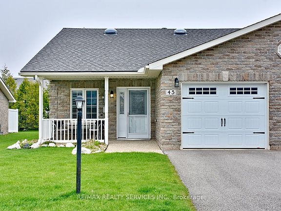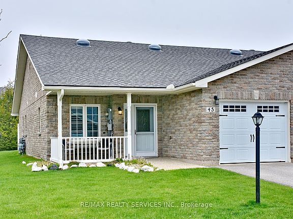 Lovely end unit bungalow in Wasaga Meadows community. Enjoy your coffee on your covered front porch! This open concept home is 1263 sq.ft, with two good sized bedrooms and two baths~ The kitchen has a ton of cupboards and stainless appliances, including a micro/exhaust. A large island offers extra storage and a great spot to hang out and read the paper or enjoy a meal! The living room offers a big patio door walkout to a large concrete patio backing onto trees for extra privacy! There's a natural gas hookup for your BBQ tool The warm & spacious carpeted primary bedroom boasts a generous walk-in closet and a 3 pc ensuite bath. The 2nd bedroom is at the front with a big window offering lots of natural light, carpeted floors keep you cozy for those winter nights! There's a main floor laundry with a storage room and a full 4 pc main bath. The garage access is off the front hall, with a garage door opener and remote and lots of upper storage space! The 55+ Parkbridge community provides a beautifully planned neighbourhood with a welcoming environment with lots of amenities and activities for residents. Tons of recreation close by with the new Community Centre with arena, two schools and recreation offerings! Close to the beach, shopping, entertainment and the river! See broker remarks for Parkbridge Land Lease and Maintenance Fees. This isn't just a home, it's a lifestyle! Enjoy the freedom of low-maintenance. living & the beauty of retirement near the water!