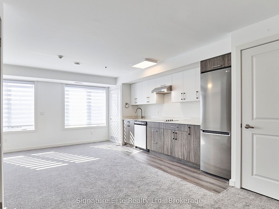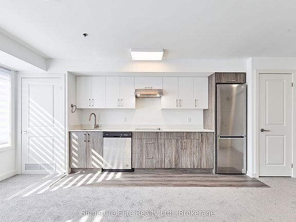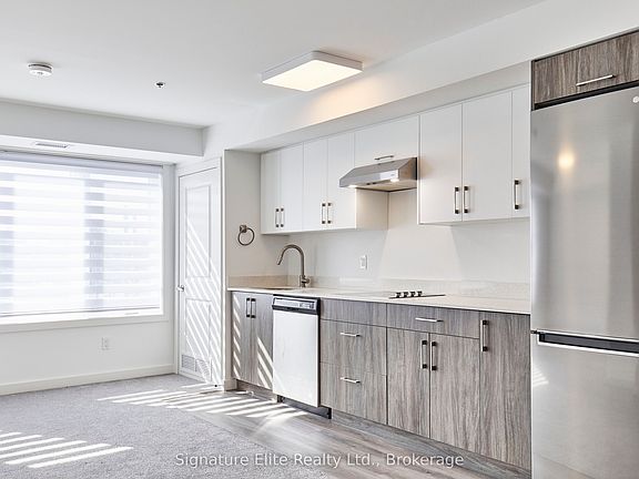 Bright studio suiteOpen-concept layoutModern kitchenStainless steel appliancesTiled backsplashEnsuite laundry