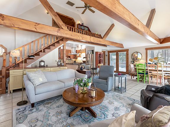 This spectacular Silver Lake waterfront is lake life living at its best with 100 feet of sandy shoreline, private 40ft patio dock, outside entertaining firepit area and expansive upper & lower decks that capture both sunrise and sunset. This special home has been immaculately maintained, tastefully updated and is being sold turnkey including kayaks, paddleboards, rowboat and even fishing poles, everything you need to get a jump start on summer 2023! Situated on a .47-acre lot with additional acreage across Coons Point Rd, perfect for extra parking and toys. When you walk in you are immediately drawn to the cathedral ceilings, custom woodwork, exquisite oak beams, Italian stone tile flooring and sprawling lake views. Natural light pours in through the oversized glass sliders that lead outside to the large wrap around decks with retractable awning. The custom kitchen is an entertainer's dream with oversized island, stone countertops, copper farmhouse sink, GE professional appliances, bluetooth gas range with pot filler and industrial hood, soft close Candlelight Cabinetry, roomy pantry and the industrial ice maker will surely be the hit of the party! The first-floor bedroom has a large custom closet and full bathroom. The loft adds additional sleeping space for your friends and family while the lower level is a lavish water view bedroom suite with an enormous cedar closet and full bathroom. Just bring your toothbrush and bathing suit & dive into lake life living!