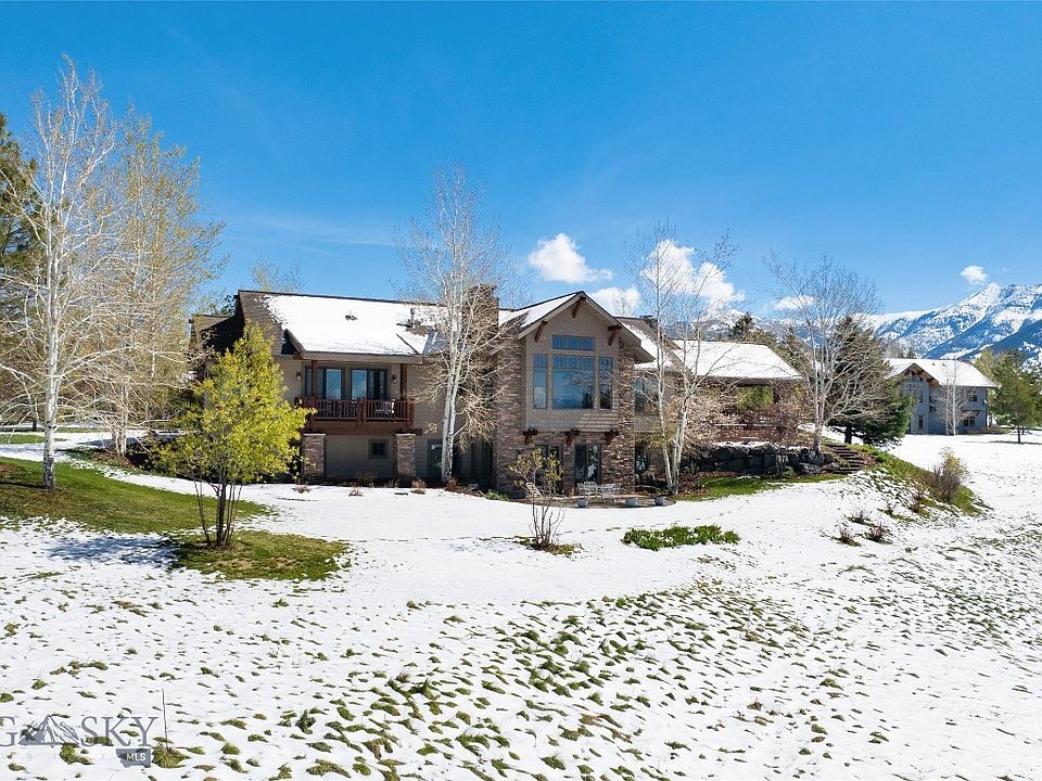 The property's exterior presents a picturesque landscape, featuring a driveway winding from the cul-de-sac, a warm and inviting front porch, an expansive three-car heated garage, and sprawling balcony and patio areas, all situated on over an acre of land with awe-inspiring views.