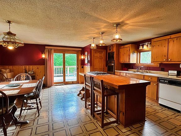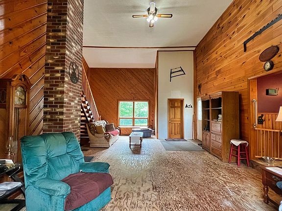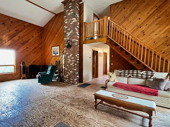 The main floor welcomes you with a grand living room with cathedral ceilings rises, anchored by a stunning brick chimney. Adjacent, a spacious eat-in kitchen featuring a large island, pantry, and sliding glass doors that open onto an expansive deck overlooking the landscape. Two cozy bedrooms and a convenient bathroom complete the main level, offering functionality and the possibility of first floor living.