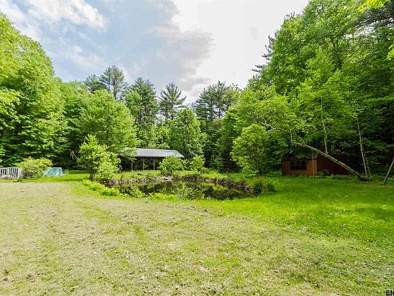 This cozy 3 bedroom colonial on a private 5.43 acre lot with a pond, also has an above-ground pool, paved pavilion, warming hut w/ wood stove, and zip-line. There are hiking trails throughout the property. There is a screened porch and a deck looking out over the pond. The rubber roof was replaced in 2015. There is an additional room upstairs that can be used as an office or kid's bedroom with a built-in desk and shelves. Less than 15 minutes to Saratoga Springs downtown. Generator is excluded from sale.