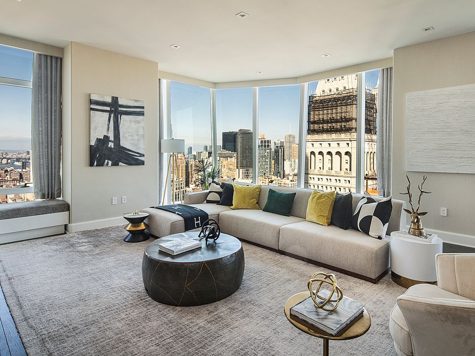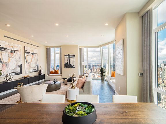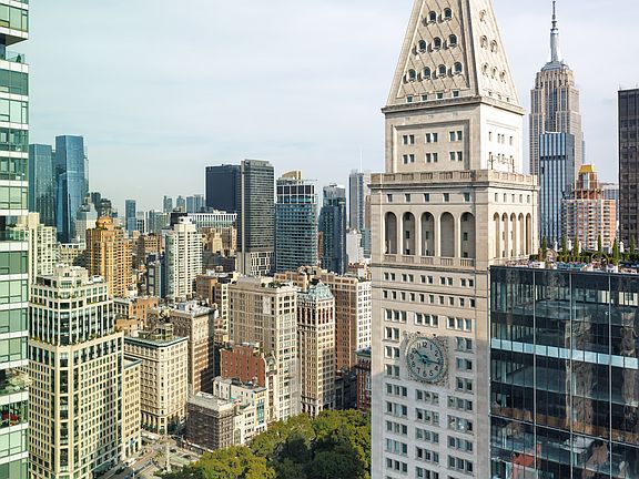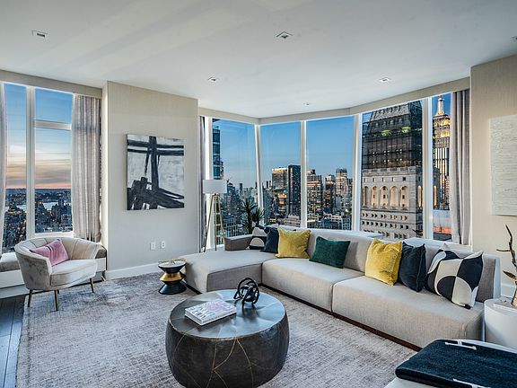 Seriously spectacular three bedroom, three bathroom condo home with sweeping city views in three directions! This grand, nearly 2500 square foot home features floor to ceiling windows throughout, providing dramatic views South to the financial district and New York Harbor, West to Hudson Yards and the Hudson River and North to Madison Square Park and midtown. Perched high above Madison Square Park, the gracious living room/dining room boasts ample room for entertaining, complete with a wet bar and wine refrigerator. The top-of-the-line, windowed chef's kitchen features marble countertops and backsplash, custom Molteni cabinetry, Nanz hardware, Sub-Zero and Miele appliances and an open North exposure. The striking, sunny primary bedroom provides endless Southern views and a massive dressing area. The luxurious en-suite marble bathroom has a double sink, soaking tub, and separate shower all with Waterworks fixtures and views of One World Trade. There are two additional large bedrooms with open views, great storage space, and a separate bathroom for each. Additional features of this magnificent home include 10.5 foot ceilings, beautiful dark stained wood floors, radiant heat flooring in the bathrooms and Kraus home automation system. Built in 2018, Madison Square Park Tower is a beautifully designed glass tower at the nexus of Flatiron and Gramercy. The white glove, 24 hour doorman building boasts an incredible array of amenities spread out across five floors including a fitness center with boxing and private training suite, golf simulator, basketball court, children's playroom, library, billiards, cards room, terrace with outdoor grill, and two gracious entertaining spaces including a fifty-fourth floor lounge.