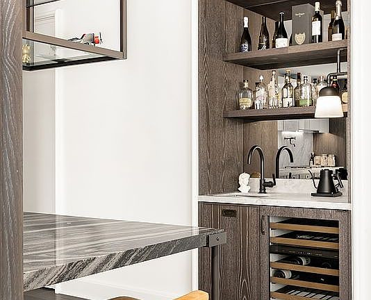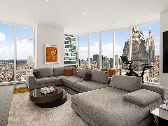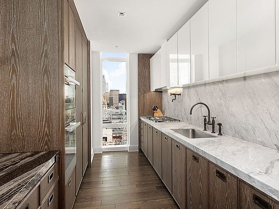 As you step off the semi-private elevator landing and into the residence, you'll be welcomed into an impressive 32-foot long corner Great Room, perfect for hosting grand-scale entertaining and dining. Floor-to-ceiling windows frame iconic western and northern views, including The Empire State Building, Chrysler Building, Flatiron Building, Clock Tower, One Vanderbilt, Hudson River, and more. The windowed galley kitchen boasts equally impressive vistas, with solid oak lower cabinets, contoured marble countertops, and white lacquer upper cabinetry. Top-of-the-line features abound in the kitchen, with Nanz hardware and premium Sub-Zero and Miele appliances. Enjoy a quick bite at the spacious counter with comfortable stools, or entertain guests in style at the stunning wet bar, featuring solid oak paneling, a marble countertop, and a Sub-Zero wine refrigerator - the perfect spot for whipping up cocktails or serving up your finest vintage.