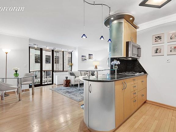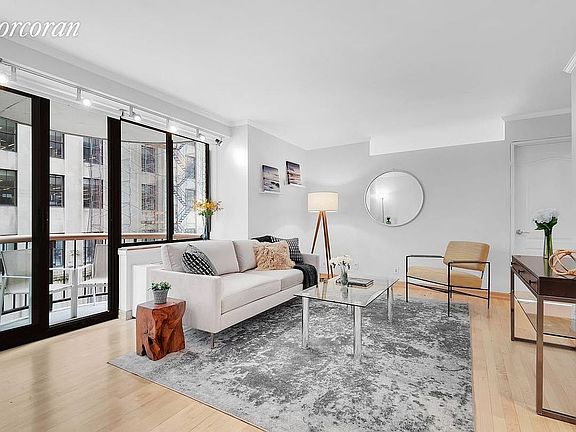 Corner one-bedroom apartment with balcony at 45 East 25th Street! This amazing one bedroom condo at 45 East 25th Street has south and west exposures with treetop views of Madison Square Park and the western skyline. You'll enjoy the spacious rooms and great custom closet space. Careful thought went into the tasteful gut renovation of this apartment. The heart of this home is the elegant great room, with space for both living and dining, and its own south-facing balcony overlooking Madison Square Park to the west. The high-tech open kitchen is designed with blonde Oak and glass custom cabinetry, granite countertops and backsplash. The appliances are a chef's dream, including a Whirlpool stainless-steel refrigerator and a stainless-steel Bosch dishwasher. The four-burner gas cooktop is by Gaggenau and the convection microwave oven is KitchenAid. The extended glass countertop doubles as a breakfast bar for your casual dining. Pristine blonde Oak hardwood flooring runs throughout the space. You'll enjoy retiring to the king-sized bedroom, with open treetop views as well as a huge custom-built walk-in closet. The sleek ceramic bathroom has the finest finishes and fixtures. Above the bathroom vanity and quartz countertop is a three-section mirrored cabinet. The tub/shower has an elegant sliding glass enclosure. The Stanford is a full-service condominium with a 24-hour doorman, gym, private courtyard, and laundry on every other floor. It is pet and pied-a-terre friendly! The building is in the best Flatiron location, overlooking Madison Square Park, and near all Park South restaurants, shopping and services. You can't beat this location for convenience to transportation. Don't miss this perfect apartment at 45 East 25th Street! See it today!