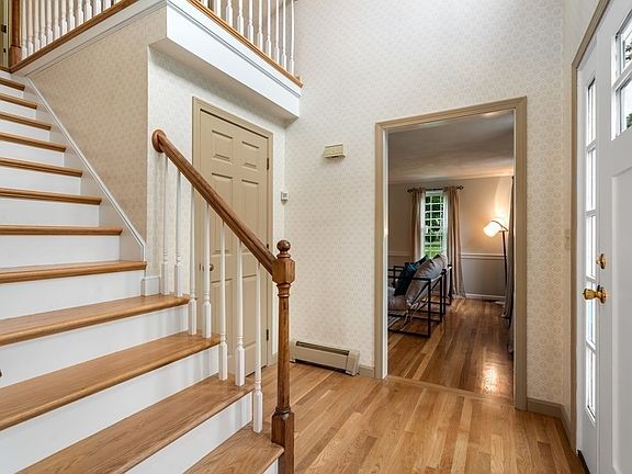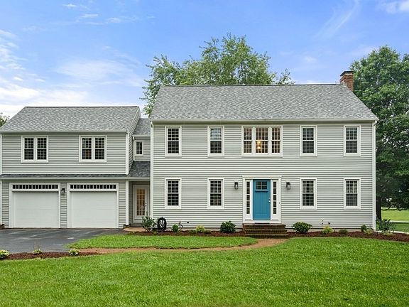 Welcome to this colonial residence on an impeccably landscaped lot near Wrentham Center. The two-story entrance greets you, connecting the front-to-back living room and dining room - both freshly painted. The living room opens onto a generously proportioned deck, overlooking a lush expanse of the flat backyard. Recently renovated, the kitchen boasts white cabinetry, granite countertops, and stainless-steel appliances. The eat-in area connects to the deck, with an excellent flow for gatherings and grilling. The primary bedroom suite w/hardwood flooring has a bonus area – perfect for a home office. The ensuite bathroom features a beautiful ceramic tiled shower w/glass door. Three generously sized bedrooms, all freshly painted, have new wall-to-wall carpeting. The tiled mudroom entrance is a hub connecting the kitchen and the 2-car garage, complete with a third rear-facing garage door. This colonial is a gem with its expert landscaping, inviting interiors, and seamless transitions.