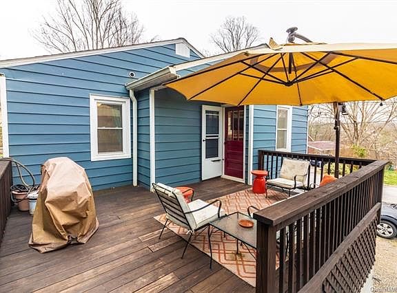 Beautiful blue house on a hill in Lucerne Park, in close proximity to West Asheville! Stepping through the front door you are greeted by a sophisticated touch of warm wood floors and a natural brick fireplace surrounded by a classic white mantel. The elevated hearth adds dimension to the room, especially with the contrast of dark wood flooring to white fireplace, these showcase the tall ceilings throughout. You will be immediately drawn into the space by the design that echoes down the hallway into a large kitchen with bountiful cabinet and counter space. Great natural light, lovely windows, and stainless steel appliances give this kitchen an emphasis of openness. There are two bedrooms, one bathroom, and ample additional room currently used for storage downstairs in the basement. This house has a great deck to enjoy the outdoors, as well as a fenced in yard! Easily maintained landscaping and home! Close to grocery stores, restaurants, the Parkway and downtown!