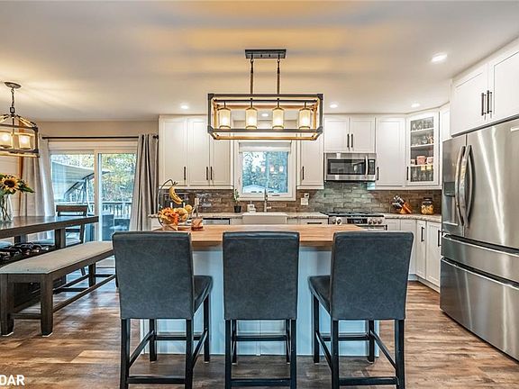 TURN-KEY MODERN LIVING NEAR GEORGIAN BAY WITH DESIGNER FINISHES & IN-LAW SUITE POTENTIAL! Tucked away on a peaceful 0.36-acre lot framed by mature trees, this beautifully crafted 2019 home offers a calm, connected, and effortlessly modern lifestyle. Step inside to the bright, open-concept main living area, where sunlight pours through large windows and highlights sleek vinyl plank floors, pot lights, and timeless neutral finishes. The kitchen is the true heart of the home, featuring crisp white cabinetry, stainless steel appliances, pendant lighting, a subway tile backsplash, a stunning butcher-block island perfect for casual breakfasts, and a charming apron sink overlooking the yard. Whether you’re hosting dinner with friends or enjoying quiet evenings in the adjoining living room, every detail feels designed for connection and ease. The thoughtful layout places the spacious primary suite in its own private wing, complete with a walk-in closet and an elegant 4-piece ensuite for a quiet retreat. Downstairs, the bright lower level boasts 8.5-foot ceilings, a large rec room with a bar, a bedroom, a full bathroom, and a walk-up entrance to the garage, providing ideal in-law suite potential or extra space for entertaining. Outside, enjoy the fresh air and natural beauty that come with being just minutes from Georgian Bay’s beaches, local parks, dining, and recreation. Complete with a fully insulated double garage with drive-through access, a high-efficiency furnace, and a 200-amp panel, this move-in ready #HomeToStay delivers comfort, versatility, and a setting you’ll never want to leave!