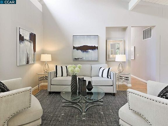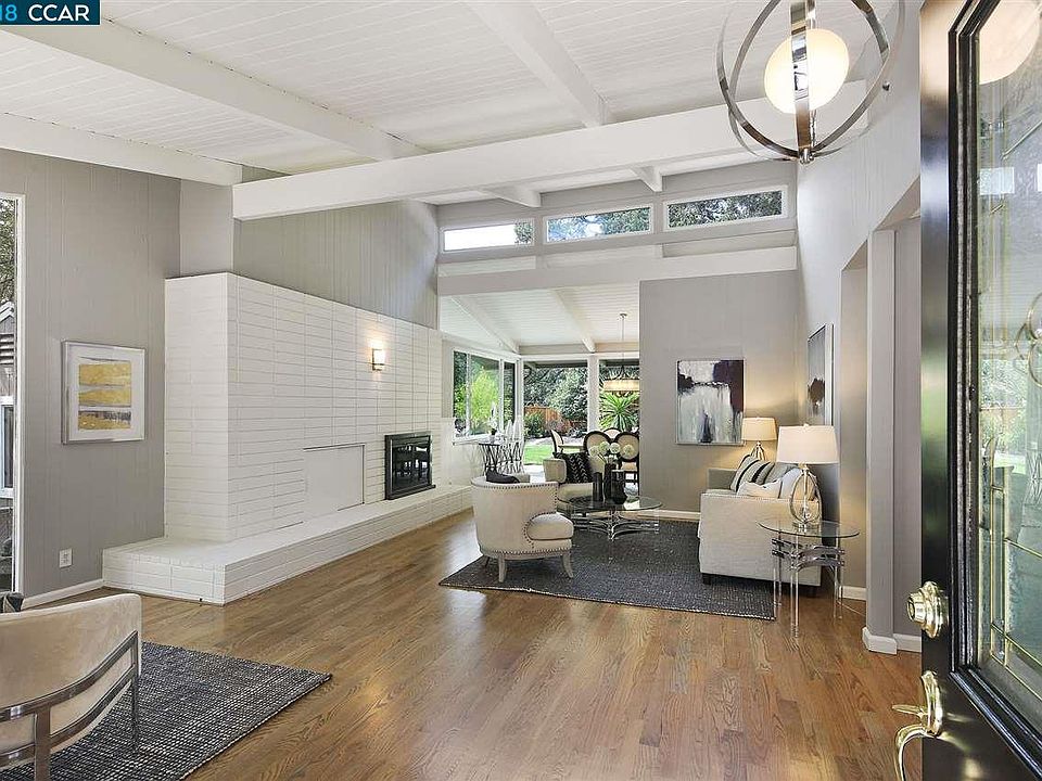 Mid-century modern meets captivating contemporary rancher. Single level with newly-refinished hardwood floors & dramatic floor to ceiling windows. Cozy fireplace for upcoming fall evenings. Cul-de-sac location means no traffic. Tree-lined street is newly paved, surrounded by oaks & lush grassy backyard. Quiet street, yet close in location, just minutes to town, restaurants, freeway & BART station. Dining room with wainscoting is just right for candelight dinner or entertaining friends. Chef's kitchen with vaulted ceilings & french doors opens to family room & backyard for seamless indoor-outdoor living & entertaining. Kitchen features breakfast bar, gas range, granite counters & loads of storage space. Four bedrooms, three full baths, large master bedroom with skylights, high ceilings, loads of closet space. Level yard with views & complete privacy. Home office, she-shed, man-cave, or playhouse, the former "pool house" provides extra room for all your hobbies. Don't miss this one!
