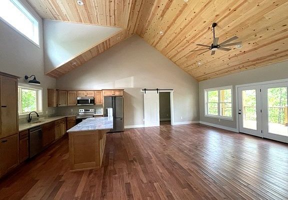 New Construction Home located in Tarheel North. Open great room with soaring tongue and groove wood cathedral ceilings, hardwood flooring, stone gas log fireplace, and custom kitchen with granite countertops and stainless steel appliances. 3 bedrooms 2 baths all on one level. Primary suite has a walk-in tile shower, double vanity, his and her closets, and access onto the covered back porch. 2nd and 3rd bedrooms share a bathroom with double vanity and tub with tile surround. Half bath and laundry room off the great room, opposite the bedrooms. Covered front and back porches. Seasonal mountain views from back of house. Full walkout basement, with poured concrete walls, has a 2 car oversized garage, unfinished area, plumbing for another bathroom plus another covered porch.