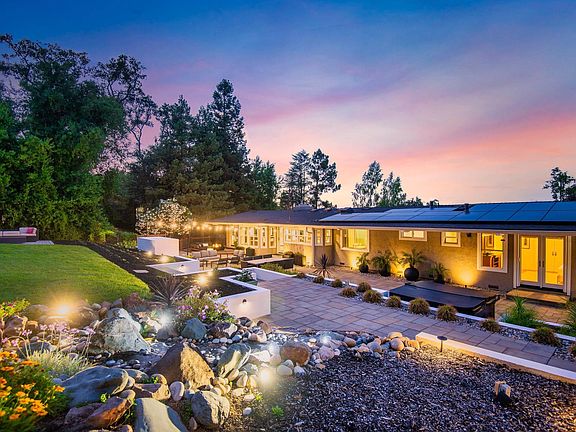Private, single-story home in Castlewood. Luxury finishes include walnut hardwood floors throughout, granite countertops, cased Milgard windows and recessed lighting. Owned Solar and a whole house Generator are additional amenities of this fabulous home. Enter the Great Room with a stacked stone fireplace and enjoy the Kitchen with luxury, stainless steel appliances including a 6 burner Wolf range, refrigerator and wine fridge. Behind alder wood door is a 300+ bottle, temperature controlled wine closet. Primary Bedroom has French doors to the back patio, walk-in closet and Bath with double sinks. One more Bedroom has a Full Bath. The Guest Suite, with its own private entrance has kitchenette with a small refrigerator and sink and has space for a bed and a couch. The Guest Bath has a glass enclosed shower with floor to ceiling tile. Outdoor spaces include an outdoor living room with a modern fireplace, an outdoor dining space and an elevated seating area by the wooded hillside. Don't miss the 10 x 12 finished room with electricity, tile floors, walnut ceiling and French doors. Detached 2 car garage and a separate golf cart garage. Quick access to freeways, top Pleasanton schools, the Club at Castlewood and Historic Downtown Pleasanton. Open House Sat & Sun, 08/17-18, 2-4p.