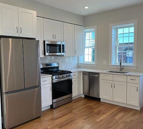 The whole unit got fully remodeled last year including new bedrooms, new bathroom and new kitchen with all new appliances installed. Located in the popular Lower Allston within minutes to Harvard Business and Engineering school. This 2-bedroom 2-bathroom 3rd floor unit offers an open concept spacious Living & Dining area, Gleaming hardwood floors throughout, Harvey windows, High quality doors, Shaker style white cabinetry in modern looking kitchen, Quartz countertops, Range hood venting outside, Stainless brand new Appliances, Bosch Washer and Dryer set in unit, Beautiful recessed lighting, Fashionably new bathrooms with Designer tiles and sleek tiled shower, a private deck and fenced-in backyard, Sprinkler and fire alarm security system. This spacious unit can be shared by multiple roommates with separated bedrooms, bathrooms and living room. Close to Universities, Shopping, Dining, Venues, Bus route & T stop at Boston Landing, Highway access. Renter is responsible for electricity and gas. Lease term is 12 months. First month rent and half month rent Security deposit required upon lease signing
