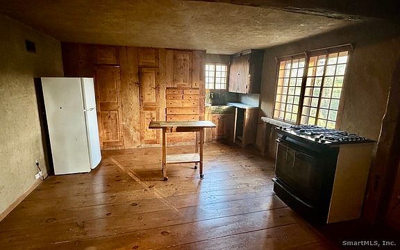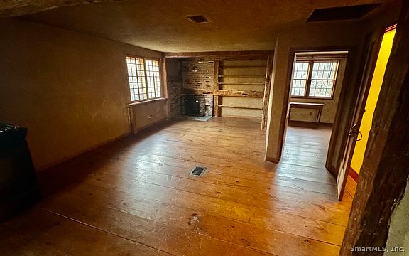 Inside, the apartment features rustic New England charm with wide-plank wood floors, original woodwork, built-ins for storage, and unique old-world details throughout. The spacious kitchen includes handcrafted cabinetry, a farmhouse-style stone sink, and large windows that fill the space with natural light. The oversized bathroom features classic vintage tile and a full tub/shower. A cozy bedroom sits just off the main living area.