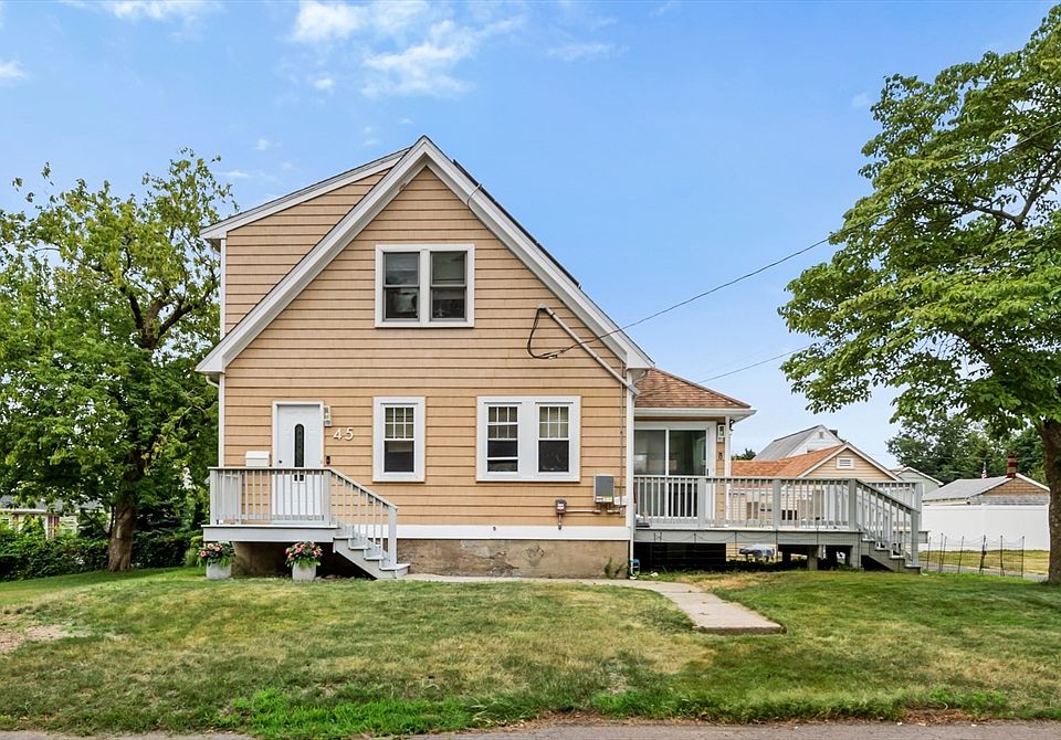 Welcome to 45 Howe Street—where coastal charm meets thoughtful design. This unique, functional home sits on a quiet peninsula in Quincy with off-season water views and summer beach access—no flood insurance required. Steps from Gull Point Yacht Club, enjoy kayaking, swimming, and scenic trails year-round. Inside, gleaming hardwood floors flow from the entry into an oversized living room perfect for entertaining. A built-in hutch adds character to the dining room, while the spacious kitchen opens to a deck ideal for summer grilling. The first-floor primary suite features a custom walk-in closet and a large bath with Jacuzzi tub and shower. Upstairs, a lofted bonus room with a picture window offers peaceful water views, flanked by two roomy bedrooms and a full bath. The double lot provides space to play and potential in the detached garage. A rare gem by the bay—welcome home.
