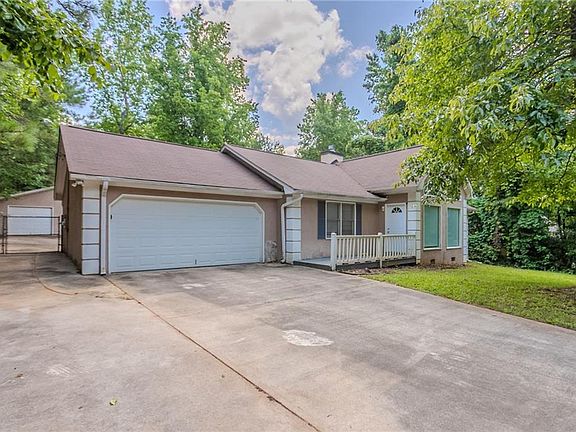Single-story ranch in Countyline Acres offering flexible space and peaceful surroundings. This three-bedroom layout features a vaulted living room with a fireplace, an open-concept kitchen with solid surface counters and eat-in area, and a spacious laundry off the main level. The large lot offers privacy, wooded edges, and a rear deck for outdoor living. Bonus garage parking includes both an attached and detached garage—great for additional storage or workspace. No HOA or rental restrictions, just minutes from downtown Palmetto and easy access to I-85.