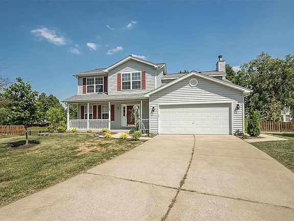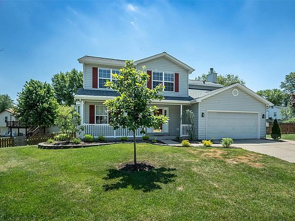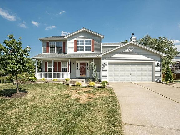 This spacious 4-bedroom 2 Sty features light-filled rooms with wide plank flooring, detailed trim work & bay windows. Wide covered porch entrance leads to gracious foyer, formal living & dining rooms and family room with brick fireplace & wide bay window. Newly updated kitchen with white cabinetry, quartz countertops, stainless steel appliances & center island adjoins breakfast room with atrium door that opens to patio. Primary bedroom suite with cathedral ceiling, walk-in closet & luxury bath offers an appealing retreat. 3 Additional bedrooms & hall full bath complete the 2nd floor living quarters. Lower Level entertainment space includes recreation room & game room. Situated on a private lot at the end of the cul-de-sac with fenced level backyard & stamped concrete patio. Conveniently located just minutes from shopping & restaurants with easy access to Hwys 94 & 364. Award-winning Francis Howell School district.