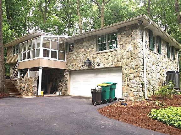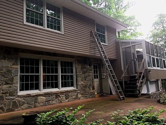 Stone masonry foundation with vinyl siding Large heated and finished garage Large cement patio in wooded backyard
