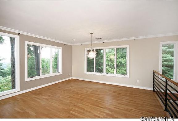 -Panoramic long range mountain views, 2.56 private acres + 2500SF in North Asheville. Contemporary open living area surrounded by large windows and French doors, allowing abundant natural light and stunning views from most rooms. French doors to wrap-around deck, hardwood & tile floors, carpeted master, gas fireplace & stove, skylights, walk-in closets, tile shower and micro-jet tub, 2 car garage, mature trees, and low maintenance lawn. Minutes to downtown Asheville and Weaverville.